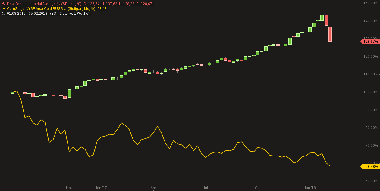 nicht wie von wir angenommen auf 25260 Punkte gestiegen, sondern auf 25280 Punkte bevor es wie erwartet wieder nach unten ging:)Wenn alles nach Plan läuft sollte es jetzt weiter runter gehen bis zur Aufwärtstrendlinie.Sollte diesen dann nicht halten sehe ich den DOW schnell auf 21540 Punkte fallen.Wenn es so kommen sollte muß man die Gesamtsituation dann nochmal neu bewerten.