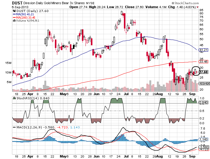 Auf Tagesbasis haben wir beim DUST ein "bärische Harami", was darauf hinweist, dass der Dust nächste Woche fällt und die Minenwerte steigen...