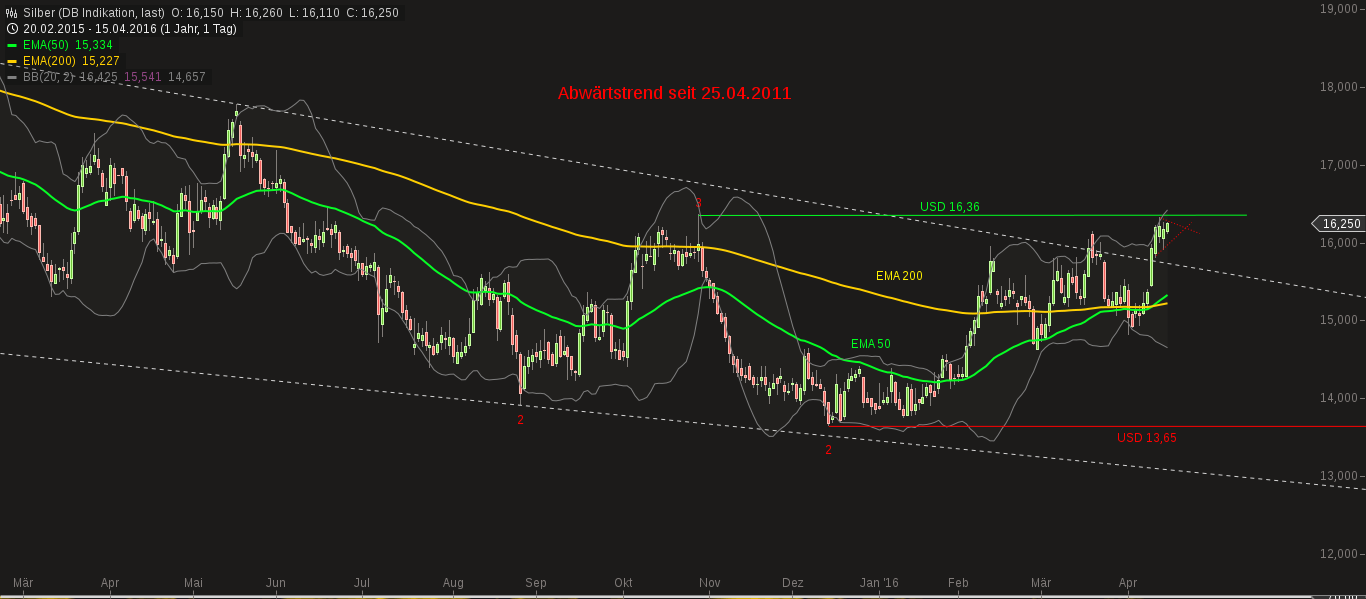 Diesen Montag, am 11.04.2016, war es dann soweit. Wir gelangten zum Beginn der eigentlichen Besteigung. Hier ist die Strecke bis zum Lager 1 (USD 21,7) mit Fixseilen ausgestattet, sodass wir zügig vorankommen sollten. Das ›rising window‹ vom Montag (USD 15,32) war auch bereits die erste Fixseil-Absicherung, welche uns am Donnerstag und am Freitag vor einem Abrutschen bewahrte, nachdem wir zuvor ein zu hohes Tempo gegangen waren. Kerzentechnisch betrachtet hat sich Do/Fr sogar ein ›tweezers bottom‹ in Kombination mit einem bullischen ›harami‹ entwickelt. Ausserdem befinden wir uns jetzt wieder an der Aufwärtstrendlinie (strichliert) als zusätzliche Unterstützung. Bullische Aussicht für die kommende Woche also, im übrigen gab es diese Woche ein zwar kleines, aber immerhin Plus von 3 %.