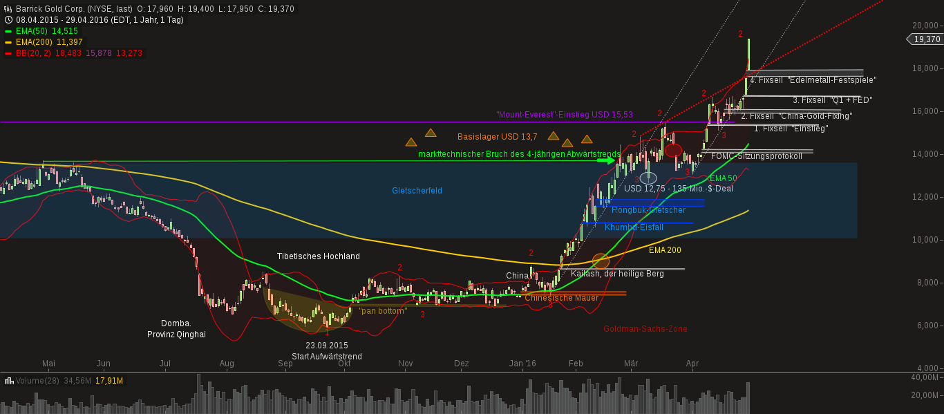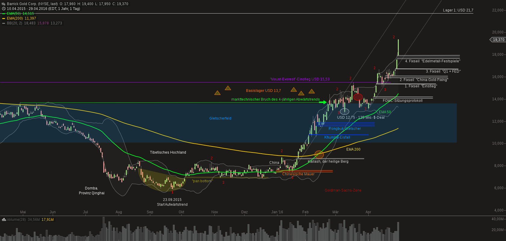 Fazit: Unter Ausserachtlassung der exogenen Einflüsse und unter Einbeziehung des Weggefährten Silber (derzeit allerdings stark überkauft), kann man feststellen, dass die langfristige Richtung für Gold und seine Minen nach oben ausgerichtet ist, es jedoch in naher Zeit mit einer längeren Konsolidierung (lediglich auf der Zeitachse) oder auch einer Korrektur (auf der Wertachse) kommen müsste, nachher jedoch eine Fortsetzung der Rallye erfolgen sollte. Dabei werden aller Voraussicht nach der untere Rahmen des 4. Fixseiles ("Edelmetall"-Festspiele) sowie das Hoch der Freitags-Kerze die Kanalbegrenzungen der erwarteten Konsolidierungsphase bei Barrick bilden (das sind immerhin 10 % bzw. 1,7 USD Korrekturpotential). Im Hinterkopf ist allerdings immer zu behalten, dass subversive Kräfte zerstörerisch in die Chartstruktur eingreifen können (Stichwort ›nächtliche Goldpreis-Attacken‹, siehe auch roter Kreis im Barrick-Chart) und den Kurs auch noch darunter drücken könnten. Positiv zu erwähnen ist, dass Gold am Freitag auch ein Schutzschild (›rising window‹) bei USD 1.270 eingerichtet hat, das eine hervorragende Basis für eine weitere Gold-Rallye – nach einer gewissen Konsolidierungsphase – bildet. An den roten horizontalen Linien im Chart kann man erkennen, dass der Weg nach oben mit etlichen Steinen gepflastert ist. Es ist also mit einer stufenweisen Rallye zu rechnen (also in 15 bis 25 USD-Schritten): Anstieg – Konsolidierung – Anstieg – Konsolidierung – …