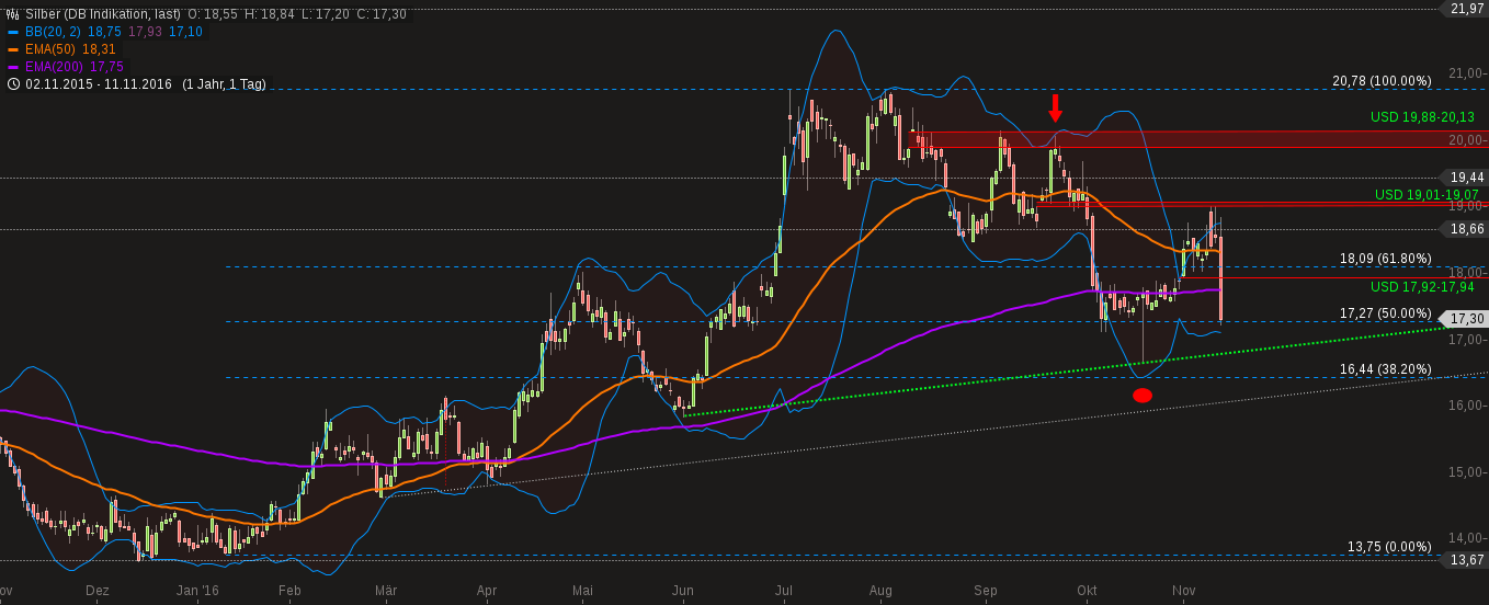 Silber reagierte rund um die Wahl zuerst noch am gelassensten. Wurde auf dieses Edelmetall vergessen draufzuhauen, oder galt es als Industriemetall so stark? Nein, Silber verfiel zeitverzögert am Freitag.