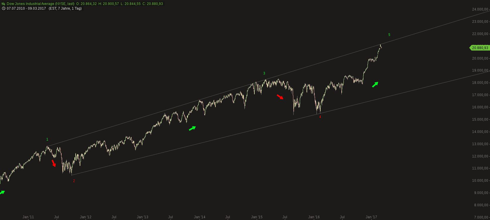 Der Dow Jones hat übrigens exakt an der oberen Linie gestoppt ... und wartet dort womöglich auf Janet od. Donald od. sonst irgendwas, das ihm einen Schubs rauf od. runter geben kann :-)