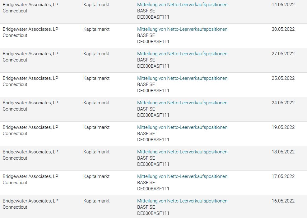 Ray Dalio wettet seit Tagen ...gegen Europa. u.a. gegen BASF, z.Zt.: Prozentsatz des ausgegebenen Aktienkapitals: 0,51 %