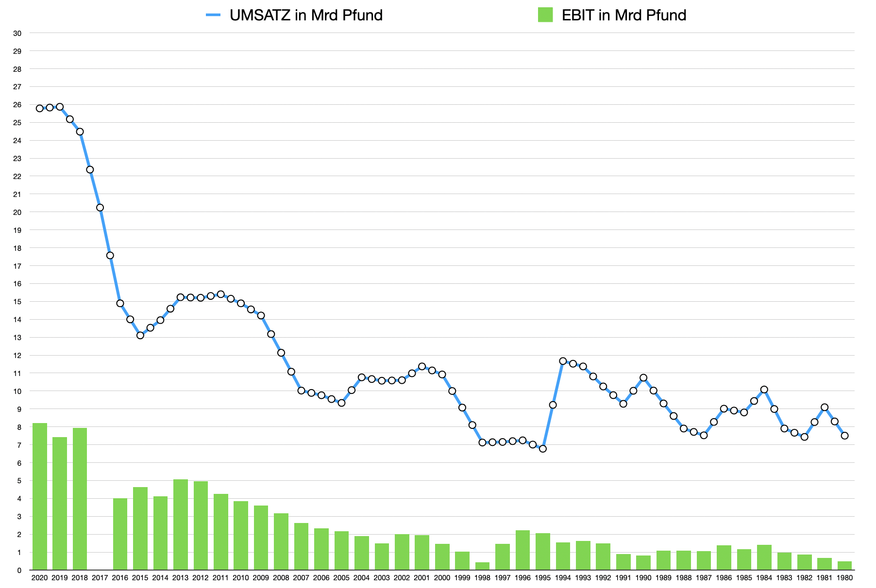 Ein weiteres falsch eingeschätztes Risiko sind Wirtschaftseinbrüche, aus 40 Jahren Datensatz geht zwar bevor, dass Mitte der 90er Jahre es zu einem signifikanten Umsatzeinbruch kam, jedoch das EBIT davon völlig unbeeindruckt blieb. Auch gab es danach hin und wieder Umsatzrückgänge, aber das EBIT ist immer weiter gewachsen. Ausserdem wird bei einer Krise nicht unbedingt weniger geraucht, vlt. eher mehr (Zwinkersmiley).