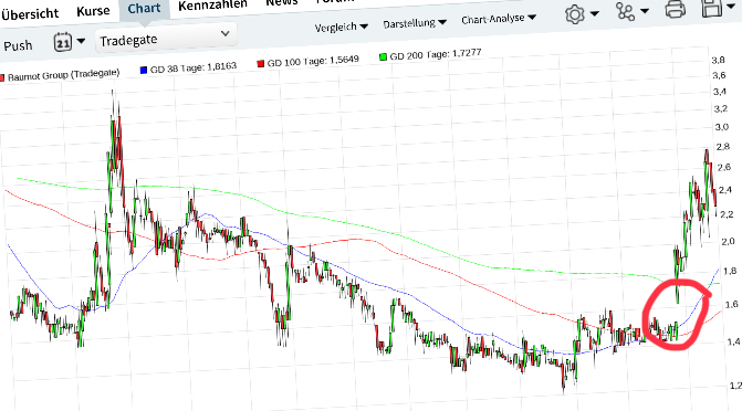 Ich kann Trader nicht verstehen, die sich jetzt noch trauen, Papiere aus der Hand zu geben. Klar, die Idee dahinter ist: "Teuer verkaufen, nachher wieder günstig nachkaufen". Die Aktie von BAUMOT ist zwar volatil, aber nicht so sehr, dass sich das lohnen würde, finde ich! Ich habe mich gerade gefragt, ob ich es auch mal mit kurzfristigem Trading ausprobieren soll.