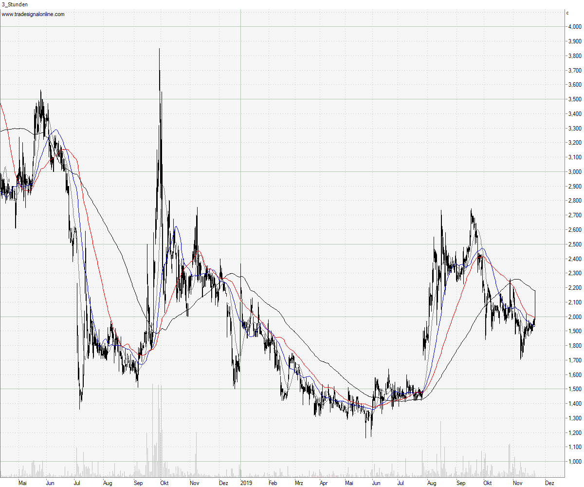 Wie vermutet, wurde die letzte Übertreibung mit einem Anstieg bis an die 200er SMA (2,15 / 2,20 EUR) abgebaut. Fallende 200er SMA in der 2 Std. und 3 Std. Periode bedeutet immer noch Abwärtstrend. Es gibt immer noch tiefere Tief's und tiefere High's. Die nächsten Tage/Wochen wird sich zeigen, ob der Kurs oberhalb der 1,90 EUR einen Boden ausbilden, die SMA's zum Drehen bringen kann und evtl. mit einem neuen Verlaufshoch einen Trendwechsel einläuten kann. Sollte der Kurs keinen Boden bilden und weiter unterhalb der 200er SMA verlaufen, könnten die 1,50 bis 1,60 EUR das nächste Ziel sein. Für mich persönlich also immer noch Watchlist.