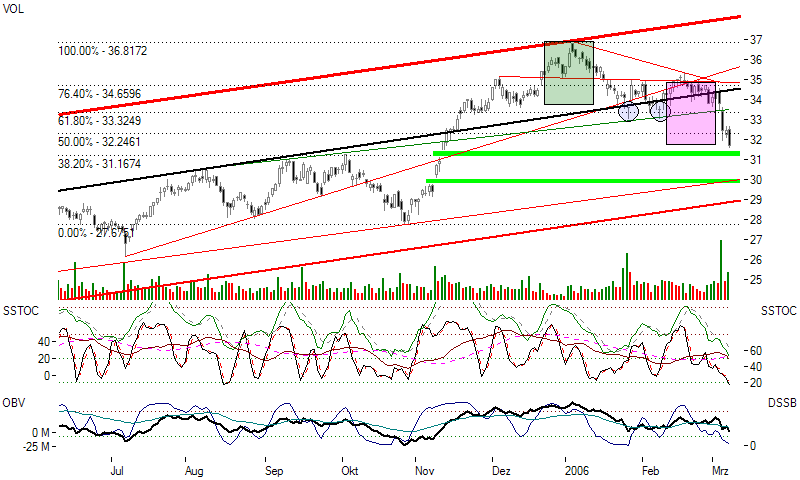 Vor diesem Hintergrund bietet die Wenning-Vorgabe Raum für positive Überraschungen, um die Aktie aus ihrem jüngsten Durchhänger zu befreien. Die Messlatte von 19 Prozent, die sich Bayer für 2006 bei den EBIT-Margen gesetzt hat, wurde mit 18,6 Prozent schon im abgelaufenen Jahr fast erreicht. Die Strategie „margenschwache Bereiche raus zu Lanxess, Roches OTC-Sparte rein" hat sich in jedem Fall ausgezahlt. Das im Branchenvergleich niedrige 2006er-KGV von 13,5 bietet da ein gutes Chance-Risiko-Profil, um jetzt gegen den Trend einzusteigen.