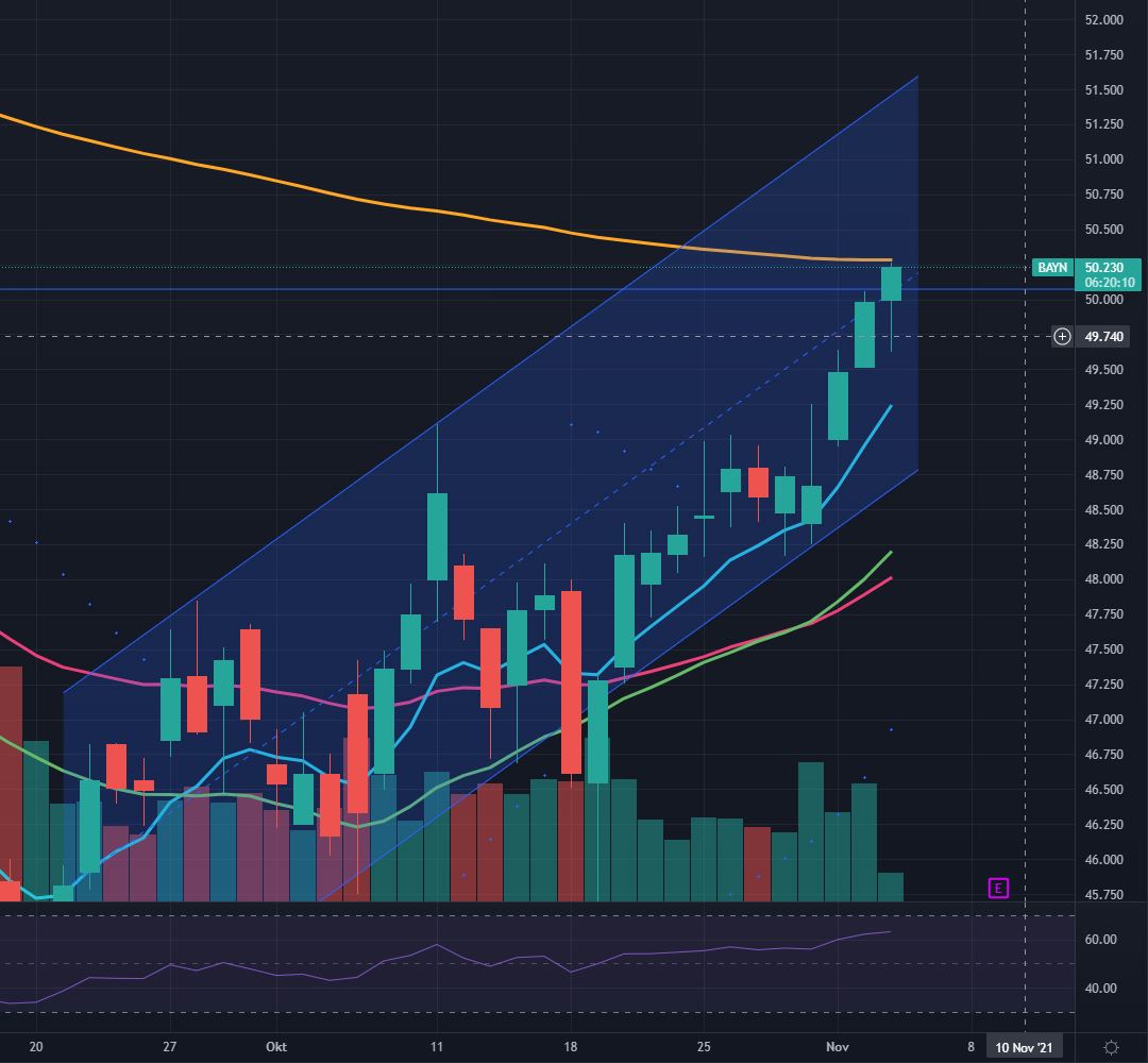 BAY001) befindet sich ausgehend von einem im Jahr 2015 bei 146,45 EUR verzeichneten Rekordhoch in einem intakten langfristigen Abwärtstrend. Im Oktober 2020 markierte sie ein 9-Jahres-Tief bei 39,91 EUR und zeigte anschließend eine Erholung bis 57,73 EUR sowie einen Rücksetzer bis auf 44,47 EUR. Das Kursgeschehen seit August kann als Versuch einer mittelfristigen Bodenbildung gewertet werden. Mit der gestrigen Auflösung einer mehrtägigen Konsolidierung an der zuletzt deckelnden 100-Tage-Linie und dem Anstieg auf ein 3-Monats-Hoch hellte sich das technische Bild auf. Bestätigend würde nun ein Tagesschluss über dem erreichten 38,2%-Fibonacci-Retracement bei 49,54 EUR wirken. Im Fokus als mögliches Kursziel steht die 200-Tage-Linie bei aktuell 51,08 EUR. Deutlicheres Erholungspotenzial entstünde erst oberhalb der horizontalen Hürde bei 51,70 EUR. Im Erfolgsfall würden potenzielle Ziele bei 52,64/52,66 EUR, 54,00-54,90 EUR und 57,73 EUR in den charttechnischen Blick rücken. Ein Tagesschluss unter der Supportzone bei 48,16-48,69 EUR würde das technische Bild bereits wieder eintrüben und einen Rückfall in Richtung zunächst 46,30/47,17 EUR oder 45,69 EUR nahelegen. Darunter würde es wieder unmittelbar bearish werden mit möglichen Zielen bei 44,47 EUR, 42,52 EUR und 39,91 EUR. Das Unternehmen wird am 9. November die Quartalszahlen präsentieren.