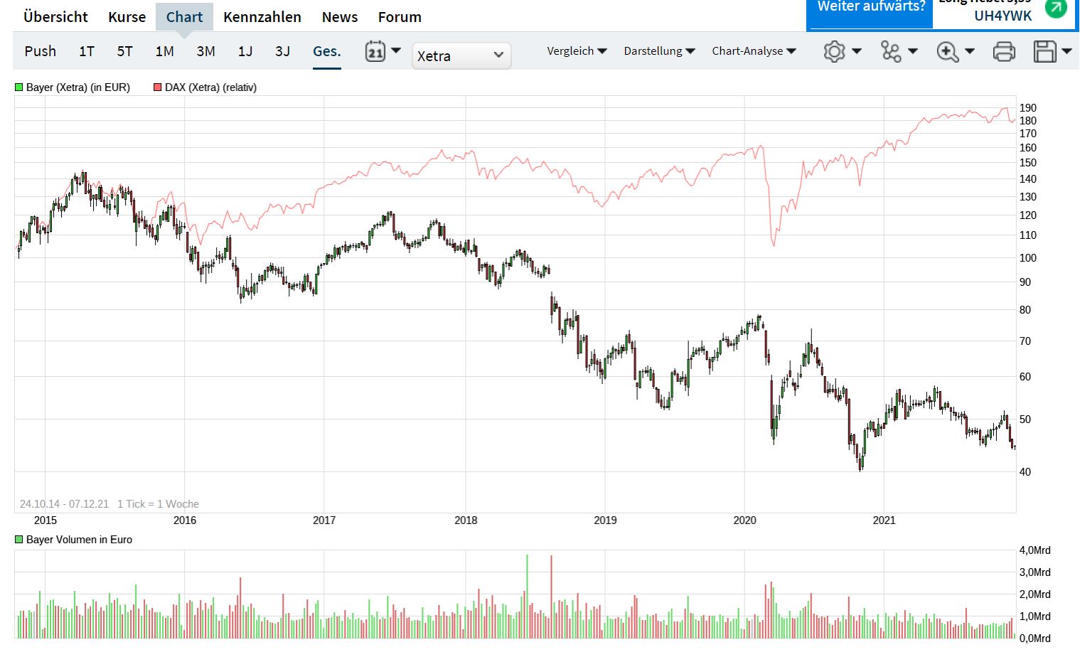 Wenn Bayer am Ende ist und wenn dann Bayer von einer Heuschrecke aufgekauft und filetiert wird, dann wird der Kurs schon wieder über 50 Euro steigen. Für ihn ist das dann ein Nullsummenspiel. Den Gewinn bekommt er von seinem Auftraggeber, Bayer so sturmreif zu schießen, wie er nur kann. Seit der HV hat er ja wieder ganze Arbeit geleistet. Das einzig Gute ist, dass der Vertrag von Baumann in nicht allzu ferner Zukunft ausläuft. Dann werden wir den Auftraggeber kennenlernen. Und dann hat das Spiel ein Ende. Denn dann wird Bayer in seine Bestandteile zerlegt werden und vom Kurszettel verschwinden.