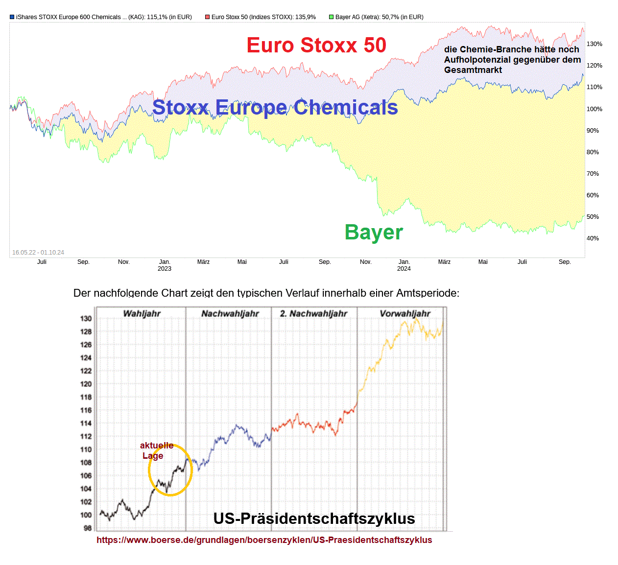 Du hast natürlich Recht, daß man stets ein gewisse Vorsicht auch behalten sollte und man nicht zu sehr in reines Wunschdenken verfällt. Sollte irgendwas einen extremen Rücksetzer im Gesamtmarkt erzeugen, dann ich auch Bayer und die Chemie-Branche nicht immun. Aber man ist saisonal jetzt in der Phase der letzten drei Börsenmonaten des Jahres, wo Börse typischerweise eher nach oben will (Herbstrallye/ Weichnachtrallye / Jahresendrallye), wo die Zinsen endlich sinken (FED wird vermutlich im Dezember nochmal um 0,5% senken) und wo auch im Vorfeld der US Präsidentschaftswahlen die Wahl-Rallyes eher die Regel sind ( =>www.boerse.de/grundlagen/boersenzyklen/...sidentschaftszyklus ) Also wenn - überspitzt gesagt - nicht gerade China in Taiwan bald einmarschiert oder sonst etwas geopolitisch sehr wichtiges passiert, dann denke ich es wird erst einmal keine wesentlichen Rücksetzer in diesem Jahr mehr geben. Eher "Zwischenverdauungen".