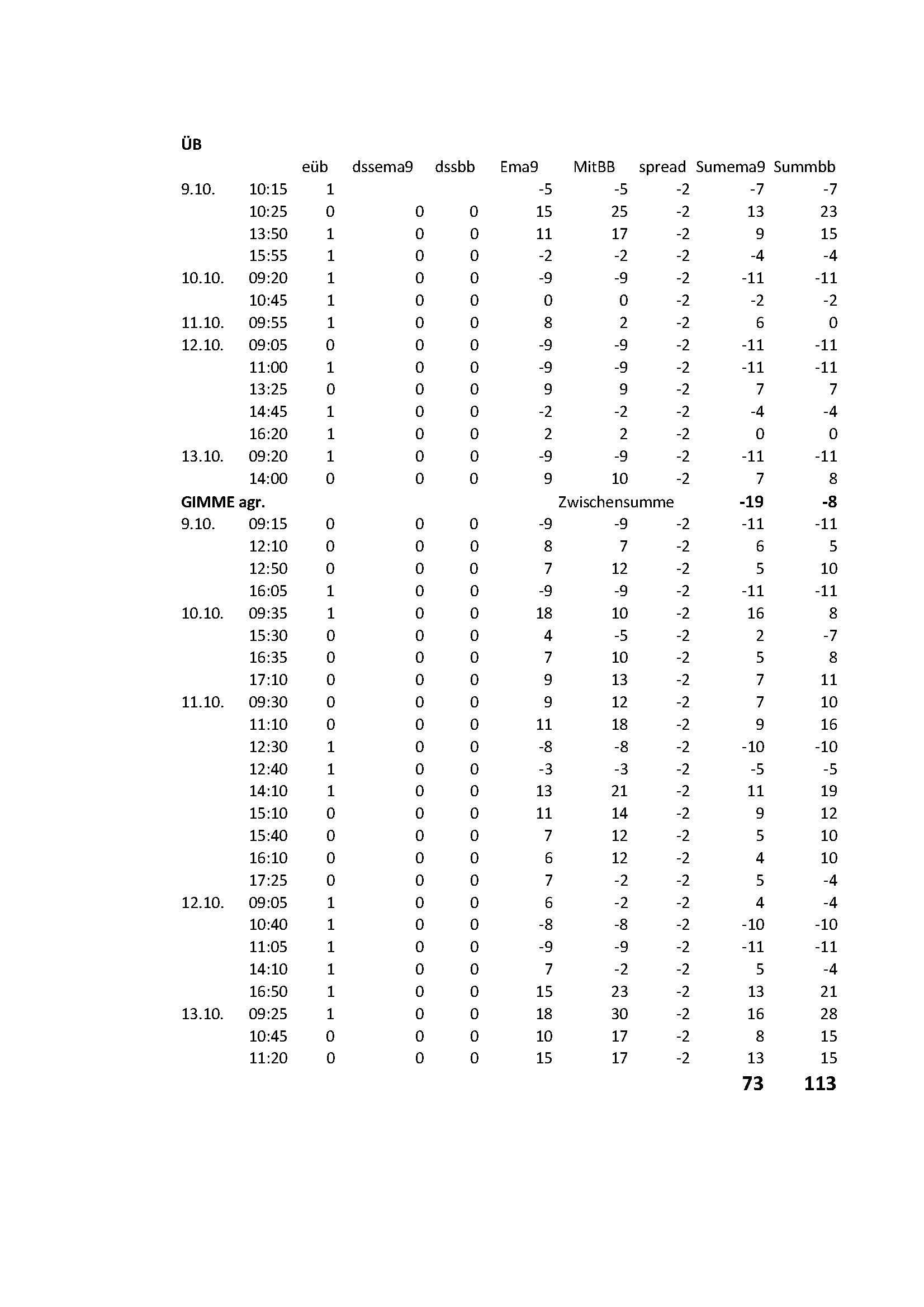 Ich habe mal all üb, eüb und (agressive) gimme trades der letzen Woche (nur DA!X)zusammengstellt so wie ich sie nach meinen Widerständen gemacht hätte. Die Tabelle gibt an Datum, Uhrzeit, erweiterte Übertreibung Ja(1) oder nein (0), Zustand des dss bei Erreichen EMA9 bzw. Mitte bb, Gewinn bei Ausstieg EMA9 bzw. Mitte BB, spread immer 2 Punkte (z.B. bei cfd, keine weiteren Gebühren) und dann die um den spread bereinigte Summe. "Gehandelt" wurde immer so, dass ein trail 9 mitgelaufen ist. Wie man sieht macht es Sinn auf mitte BB zu zielen... MHurding hätte da sicherlich mehr rausgeholt, aber ich muss es ja zu mir passend analysieren. Man sieht auch dass das agressive Gimme deutlich performer als das üb traden war - allerdings gehören die Zusammen und können in der Analyse nicht getrennt werden, da nach einem verbaselten eüb oft ein agressiver Gimme folgt. Der "konservative Gimme" wäre mit 8 lohneswerten Trades übrigens auch mit ca. 30 Punkten im plus.