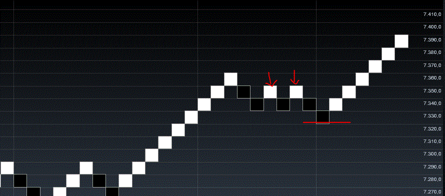 Spätestens bei Bruch der Range nach unten würde ich auf Grund von Renko diese beiden Trades schließen. Damit also Gesamtverlust für diese Trades: 24 + 27=47P oder 47*1,25=58,75€ - naja - geht gerade noch so ... 12€ Riskexzess. Da bekommt man im Moschmosch in Düsseldorf aber schon eine leckere japanische Mahlzeit mit Getränk. ;-)