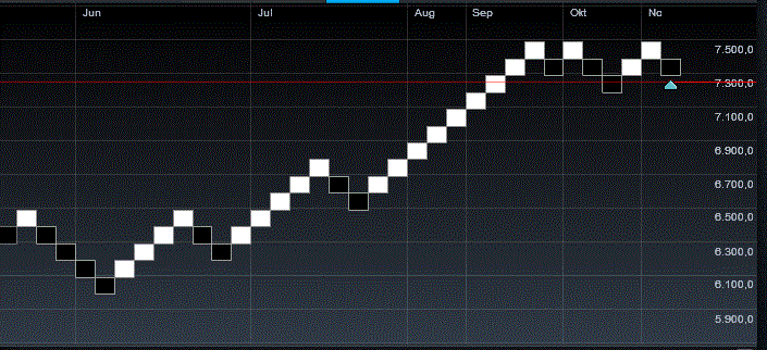 Zielbereiche siehe Chart. Für die Ermittlung von Sup/Res scheint mir der Renko wirklich sehr gut geeignet zu sein. Auch zur Beurteilung von Brüchen aus Seitwärtsranges - so wie gerade.