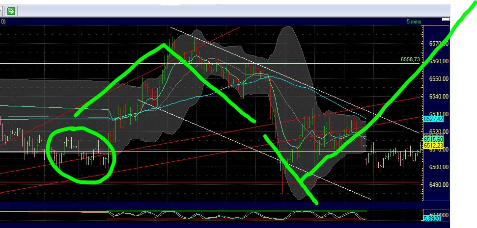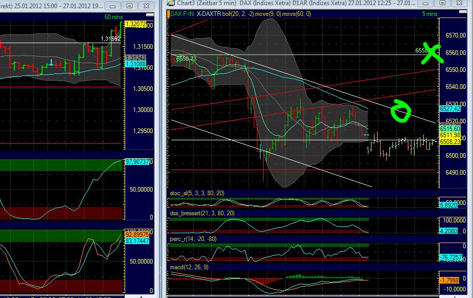 DAX 1min, der blaue Schatten das BB aus dem 5min. Der untere Indi ist RSI(14) rot und RSI(57) weiß sowie ein RSITrend (gelb)