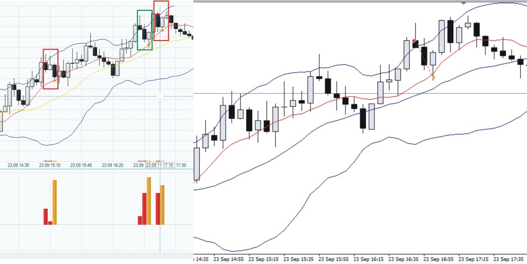 War heute ja unterwegs aber habe mal versucht sie mögliche Handelssignale von heute zusammenzufassen. Mein Ergebnis ist, dass man durchaus versuchen muss die Gewinn auch laufen zu lassen und das das größte Problem die starken Trendphasen sind in den der Kurs am BB –Rand klebt. Evtl. kann ja z.B: einer was zu dem 12:00Absturz kommentieren, bei dem wäre man mit System kaum ohne zweimal minus 9 Punkte rausgekommen.