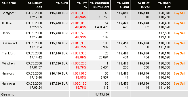 693773 bis max. 115 € eingehen. Da der Kurs im Moment über dem möglichen Kaufniveau liegt, würden wir einen evtl. Rücksetzer abwarten und nicht den Kursen hinter her laufen. Unser erstes kurzfristiges Kursziel sehen wir bei vorerst 130 € in den nächsten Wochen. Bei einer baldigen Ruhe an den internationalen Aktienmärkten sind mittelfristig auch wieder Kurse um 150 € denkbar. Wenn auch sie in Zukunft an vorderster Position mittraden wollen, sollten sie sich für die noch freien Abonnentenplätze des tradersreports anmelden. Selbst wenn sie sich als Daytrader betätigen, konnten sie mit einer PORSCHE AG 6-9 € innerhalb eines Tages verdienen.