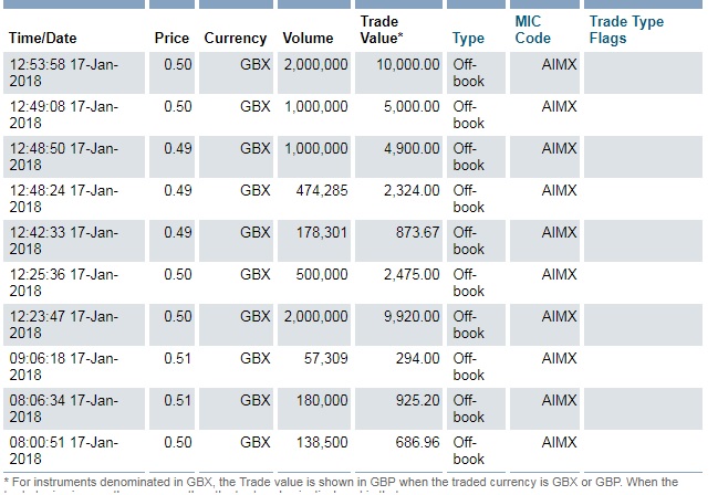 · Im März 2017 wurden durch eine Platzierung von 100.000.000 neuen Stammaktien mit bestimmten neuen und bestehenden Anlegern 1,0 Mio. GBP vor Kosten aufgekauft, zu einem Preis von 1,0 Pence pro Aktie