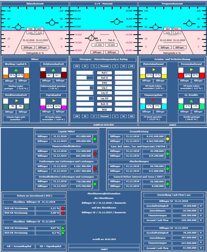 Positiv: Gesamtleistung um ca. 4% gesteigert; Liquiditätskennzahlen und Working Capital Ratio haben sich erheblich verbessert; der seit 3 Jahren wieder erstmalige Jahresüberschuß relativiert sich um ca. 24 Mil. € aus dem Ergebnis aus nicht fortgeführten Bereichen.