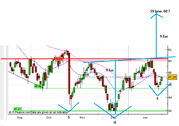 Wer bei 48,30 Long eingestiegen ist, sollte inzwischen die Hälfte der Position bei 52 geschlossen haben (gem. Analyse vom 02.02.2015 10:04 Uhr).