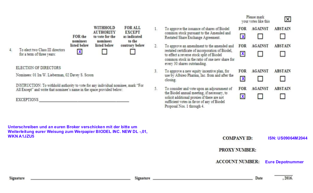 Nutzen Sie diese Vorlage zur Abstimmung, schreiben Sie Ihre komplette Depotverbindung sowie unter Company ID die ISIN US09064M2044 auf das Blatt, unterschreiben Sie es und schicken Sie es per Mail an Ihre Bank sowie an crice@morrowco.com. Da Ihnen die Proxy Number nicht vorliegen dürfte, lassen Sie dieses Feld leer.