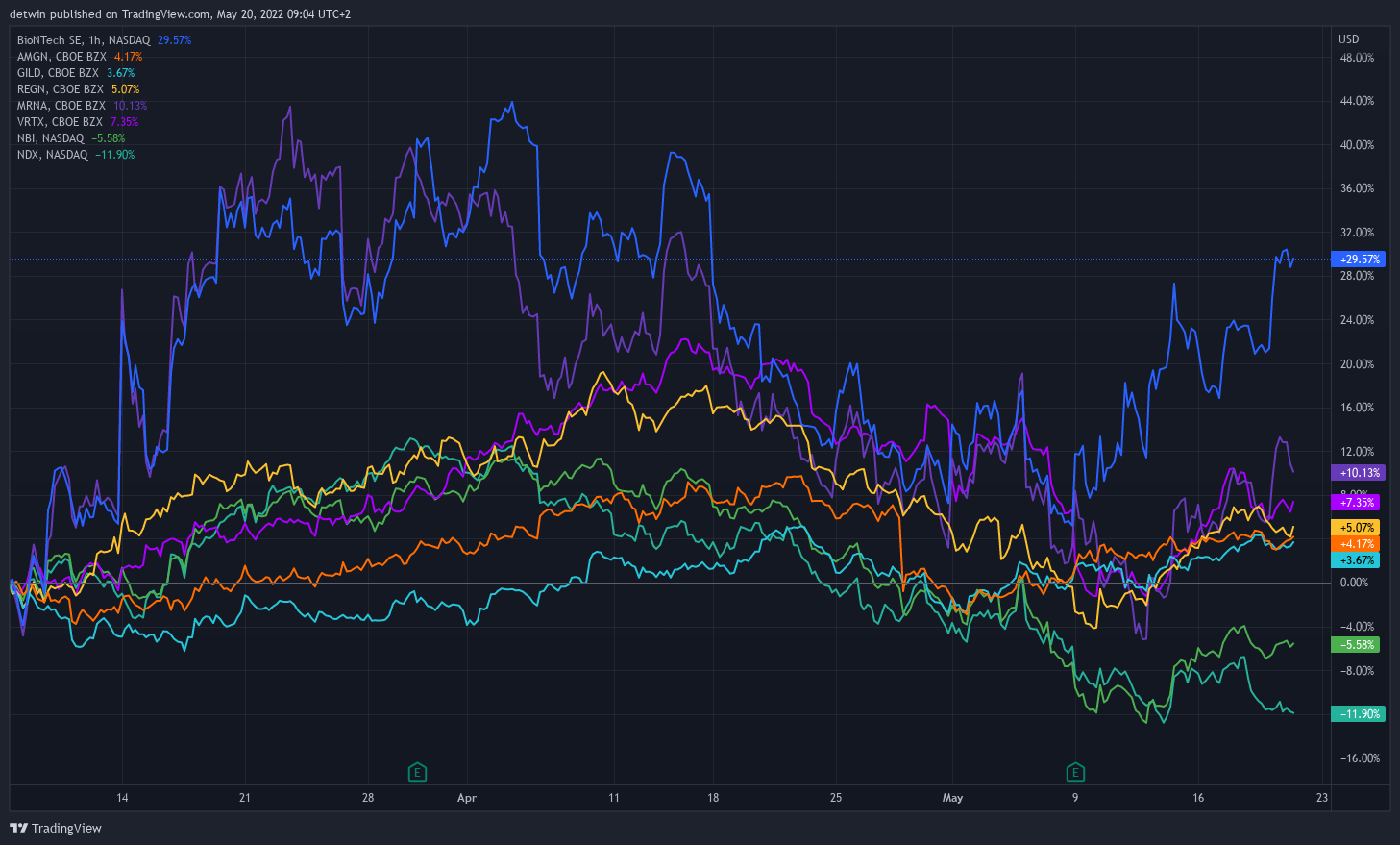 Chartvergleich mit anderen Biotech-Aktien, dem "Nasdaq Biotech" und dem "Nasdaq 100" in etwa ab dem Quartalsbericht von BioNTech.