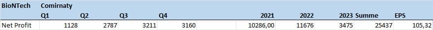 Wenn sich aus 37 Mrd USD Comirnaty Umsatz 2021 10,286 Mrd EUR Nettogewinn für BioNTech ergibt, sollte ein entsprechender Anteil aus 12,5 Mrd USD 2023 zum Gewinn bei BioNTech "extrapoliert" entstehen, mithin 3,475 Mrd EUR.