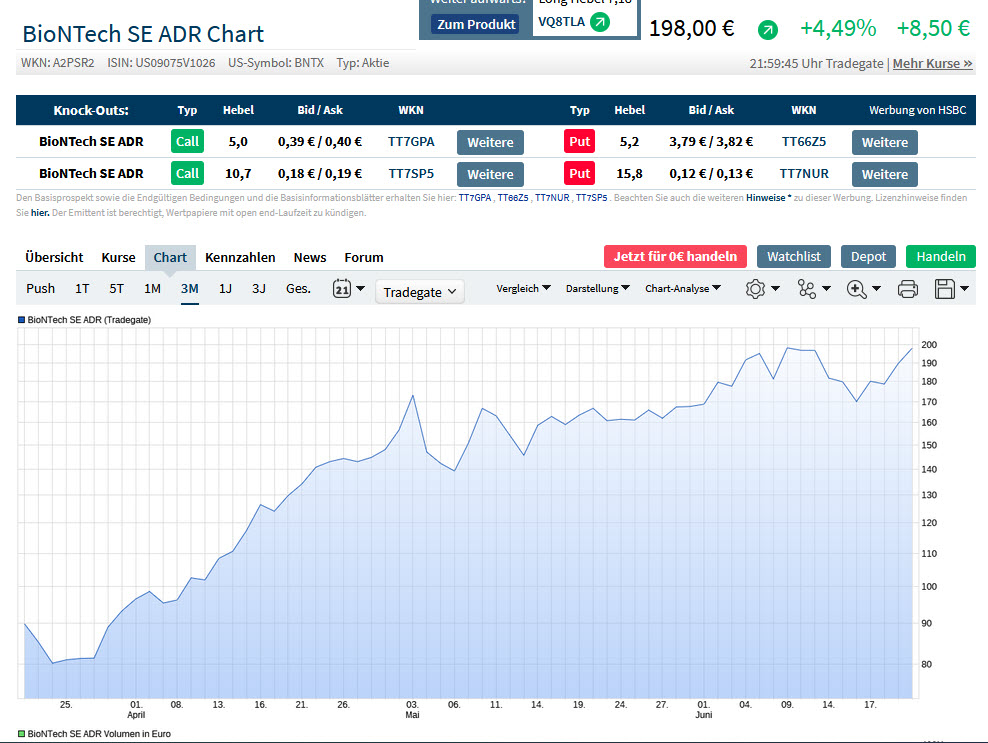 Meines Erachtens kann man die Nachhaltigkeit des Aktienkursverlaufes oder das Risiko und die Chancen bei Biontech nicht an den Chart-Verläufen festmachen, weder an amerikanischen noch an deutschen Chart-Verläufen, zumindest nicht verlässlich.