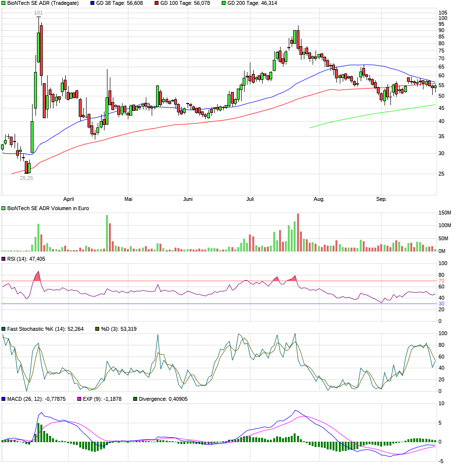 NASDAQ:BNTX eröffnete am Freitag bei 62,83 $. Die Aktie hat einen gleitenden Fünfzig-Tage-Durchschnittskurs von 67,04 Dollar und einen gleitenden 200-Tage-Durchschnittskurs von 58,66 Dollar. Das Unternehmen hat eine Marktkapitalisierung von 14,22 Milliarden Dollar und ein Kurs-Gewinn-Verhältnis von -55,60. BioNTech SE hat ein Zweiundfünfzig-Wochen-Tief von $12,52 und ein Zweiundfünfzig-Wochen-Hoch von $105,00.