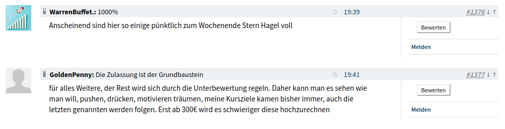 Demnach viel Glück allen die hier dann bleiben und einen nicht so tiefen Einstiegskurs wie ich hatten! Drück euch die Daumen und wünsch euch von Herzen, dass ihr irgendwann mal die ersehnten 120 Euro im Kurs seht :)!