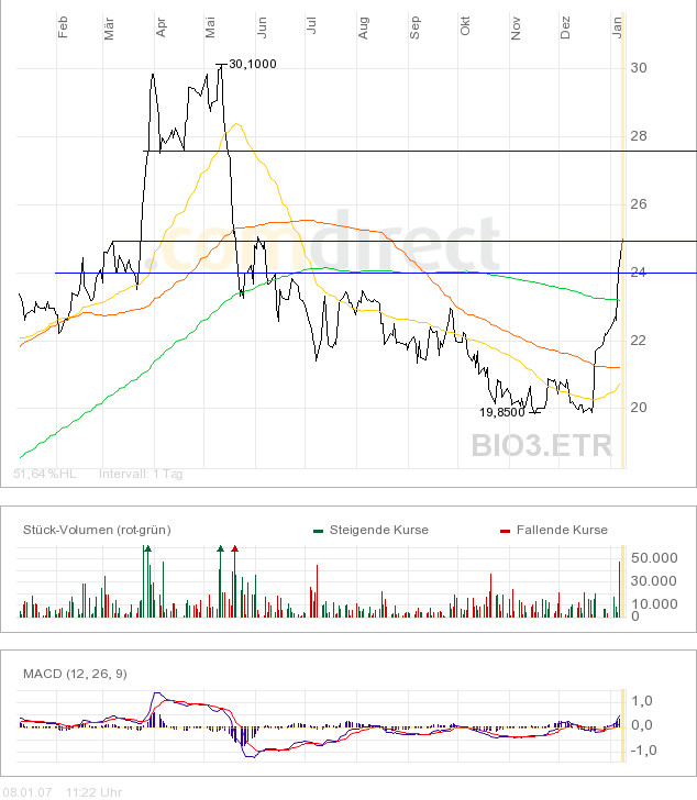 Kulmbach (aktiencheck.de AG) - Für die Experten vom Anlegermagazin "Der Aktionär" ist die Biotest-Aktie (ISIN DE0005227235/ WKN 522723, VZ) ein klarer Kauf. Mit der Erfindung eines Blut-Tests zur Bestimmung des Rhesusfaktors habe Biotest im Jahr 1948 Medizingeschichte geschrieben. Innovative Produkte zu entwickeln, sei auch heute noch das Ziel des Konzerns. Dieser sei in den Segmenten Pharmaprodukte (größter Wachstumstreiber), Biotherapeutika und Diagnostik aktiv. Biotest habe vor kurzem für das Hyperimmunglobulin Cytotect von der FDA in der Indikation Behandlung von Cytomegalie-Infektionen während der Schwangerschaft den Status als Orphan Drug erhalten. Denselben Status habe die europäische Zulassungsbehörde EMEA Cytotect bereits vor einigen Wochen für Europa erteilt. In den Vereinigten Staaten und Europa erwarte Biotest für die neue Indikation ein zusätzliches Marktpotenzial von 70 Mio. EUR jährlich. In den ersten neun Monaten des Geschäftsjahres 2006 habe Biotest den Umsatz um 17,5 Prozent auf 207,9 Mio. EUR steigern können. Dabei sei das EBIT um 19 Prozent auf 21,9 Mio. EUR gewachsen. Für das laufende Geschäftsjahr erwarte das Unternehmen einen Umsatzanstieg von mindestens 10 Prozent und eine überproportionale Gewinnsteigerung. Experten würden dieses Jahr bei Immunglobulinen, auf Grund eines Nachfrageüberhangs, signifikante Preissteigerungen in Aussicht stellen. Biotest werde von dieser Entwicklung stark profitieren. Hochinteressant sei darüber hinaus, dass Biotest mit BT-061 (Indikationen rheumatoide Arthritis und Schuppenflechte) einen potenziellen Blockbuster im Gepäck habe. Neben diesen positiven Perspektiven überzeuge auch das aktuelle Chartbild der Biotest-Vorzugsaktie. Nach Ansicht der Experten vom Anlegermagazin "Der Aktionär" ist die Biotest-Aktie für spekulative Anleger ein klarer Kauf. Das Kursziel sehe man bei 33 EUR. (Ausgabe 3) (10.01.2007/ac/a/nw)