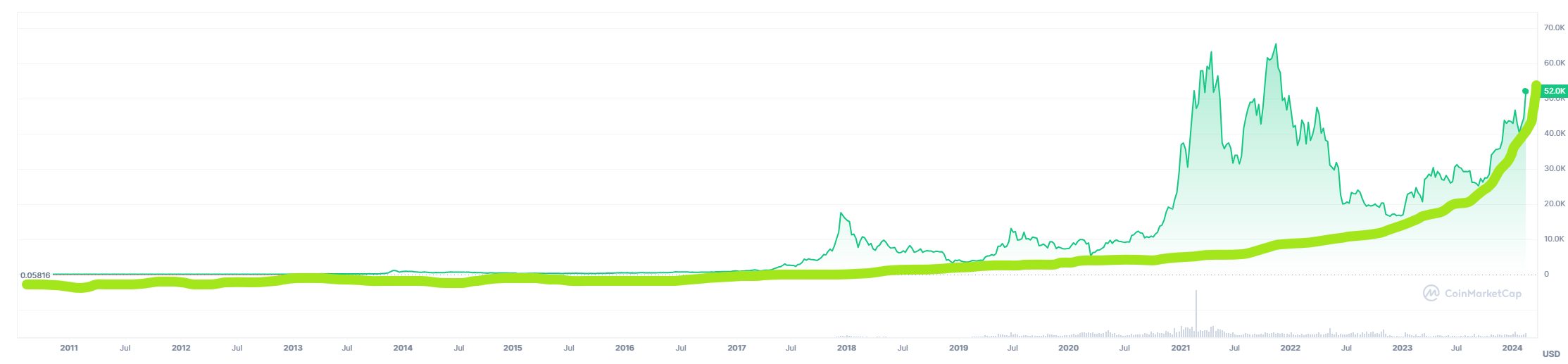 Die Stimmung am Kryptomarkt könnte kaum besser sein. Bitcoin hält sich als digitale Leitwährung auf hohem Niveau im Bereich der 52.000 Dollar Marke, wovon auch die meisten Altcoins profitieren. Die Marktkapitalisierung aller Kryptowährungen liegt laut Daten von Coinmarketcap bei fast 2 Billionen Dollar. Bitcoin macht davon alleine schon mehr als 52 % aus. Hier dürfte aber noch lange nicht Schluss sein. Ein Analyst, der schon früher durch seine bullishen Prognosen aufgefallen ist, die sich am Ende aber immer bestätigt haben, geht von einem durchschnittlichen Kursziel von 3 Millionen Dollar aus. "