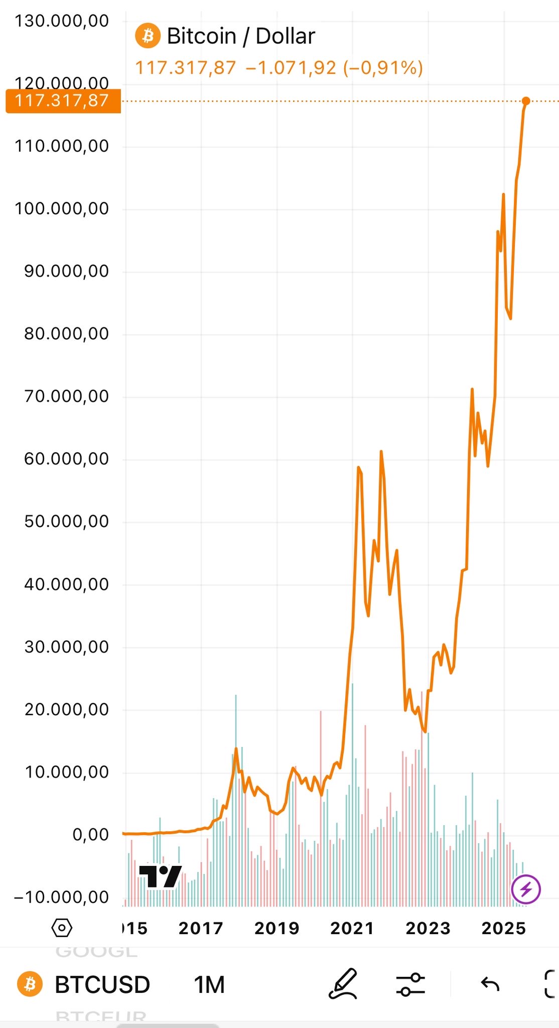 Und siehe da...der Kurs schmierte nicht ab wie 22, 3-4 Jahre waren nicht nötig um wieder auf 100 TSD zu kommen, nein....es folgte nach einem dip bei 73 TSD gar ein neues ATH 122 TSD, das jetzt schon wieder in Reichweite ist.