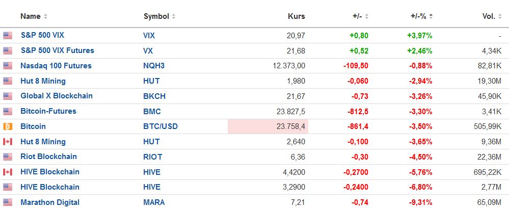 Vola steigt, Bitcoin- / Nasdaq Future schwach