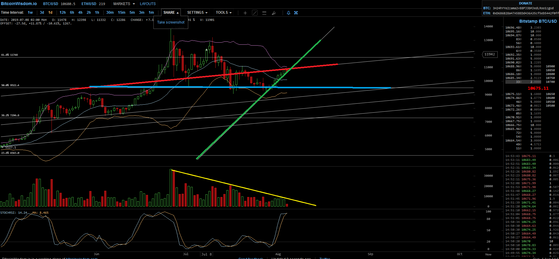 Das Dreieck, ist weiterhin aufsteigend und symbolisiert, einen bullishen Tageschart.