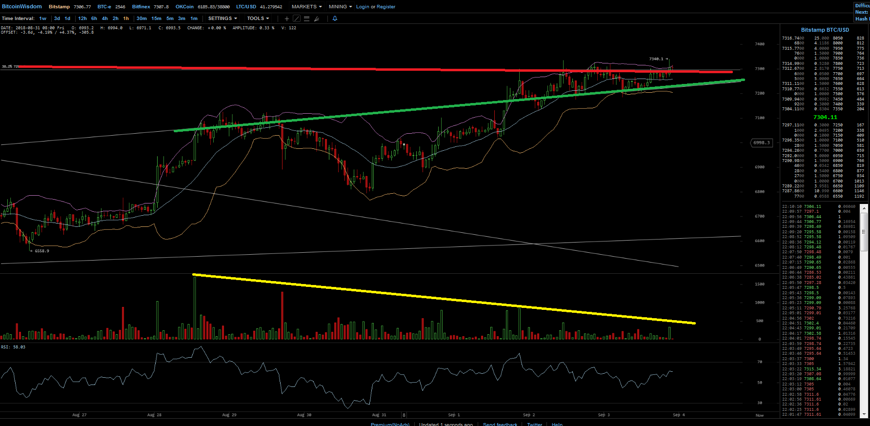 Das Spielchen ist noch nicht vorbei, eine Verhältnissmäßig kleine Order im ASK zu 150BTC irgendwo im Bereich 7.3K USD, ein kleiner Teil was heute gekauft wurde dient nun dazu noch ein wenig zu schütteln, vermutlich werden dadurch Bots verleitet zu verkaufen, man merkt die BIDs werden in größeren Blöcken mit minimalen Spread zum ASK erstellt, sobald Verkäufe stattfinden bekommen es die großen Blöcke ab und es werden weitere BTC eingesammelt.
