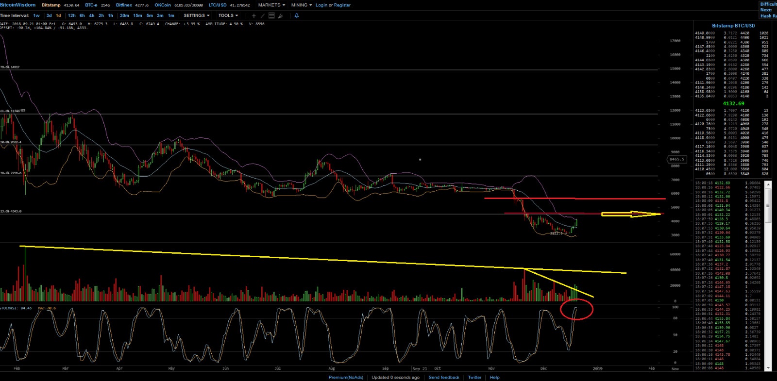 hier ist der Stoch RSI schon sehr hoch, während er Long also 1 Woche und 3 Tage, sich gerade vom Boden löst also nahe NULL oder unter 30 Punkte. Unter 30 Punkte gilt der BTC ist überverkauft, also auf LONG Basis
