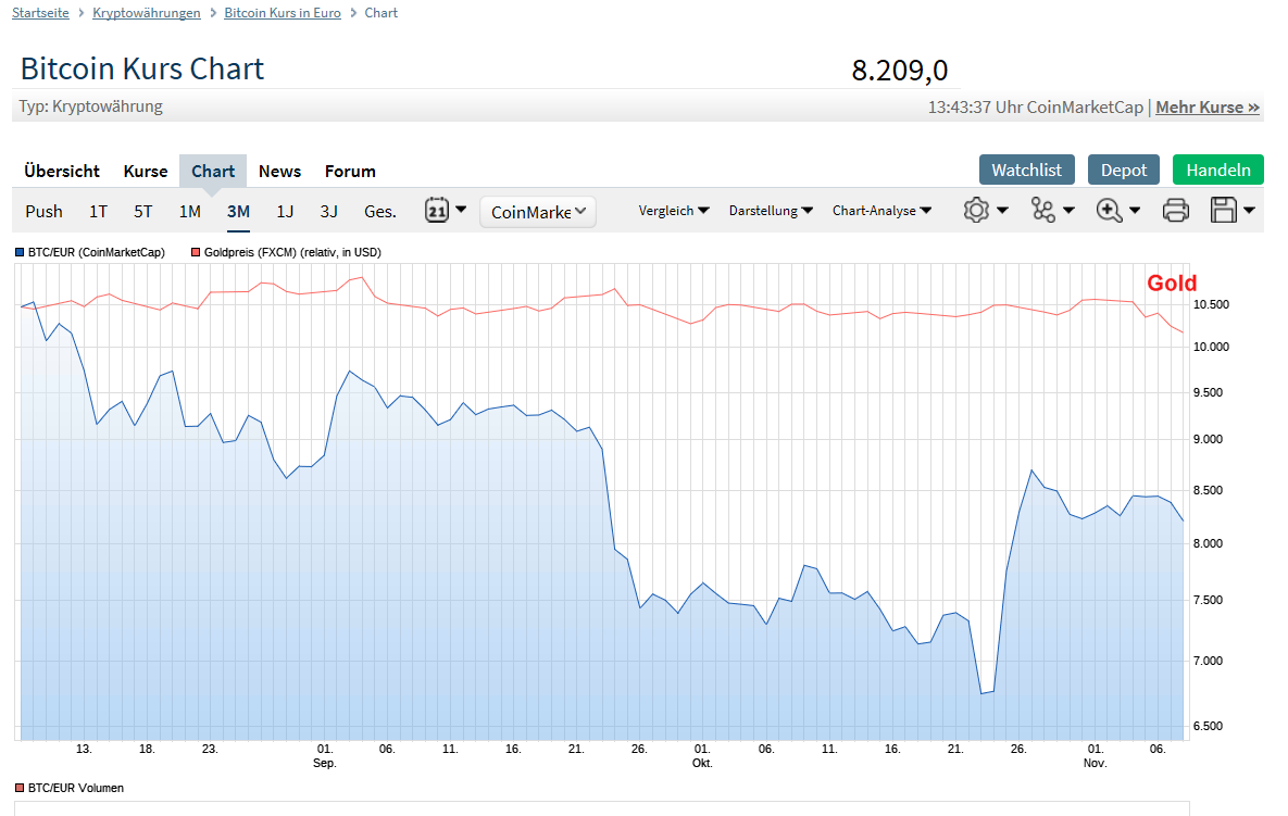 In den letzten drei Monaten hat BTC fast 20% verloren, Gold hingegen nur 3%.
