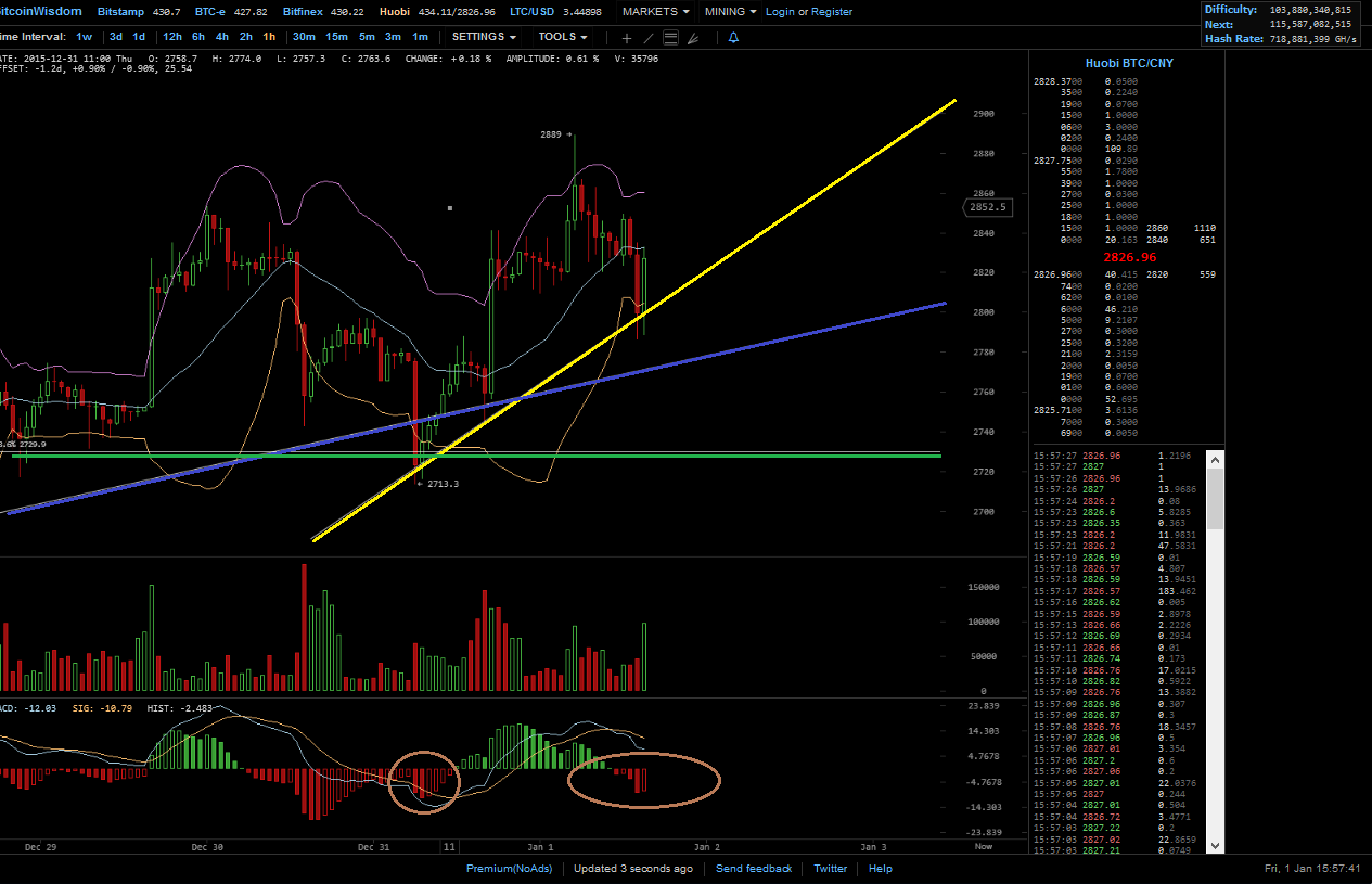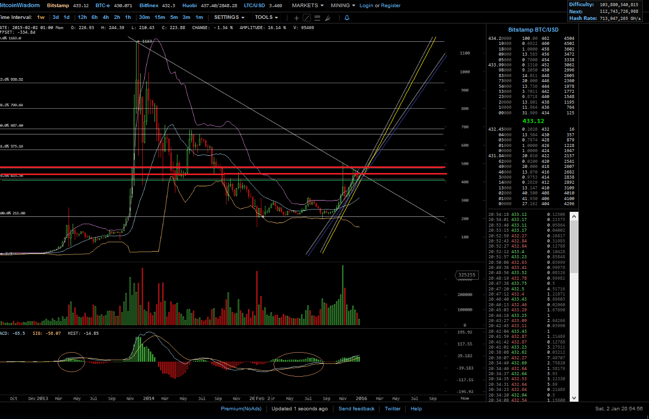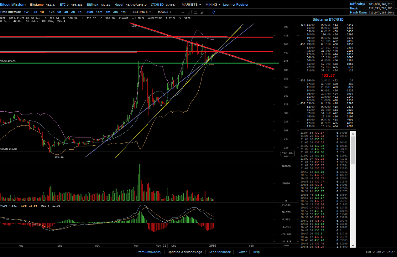 hier hat MACD (zeigt keinen Trend, sondern die Marktbewegung an) die down welle hinter sich, die zwei linie sind nahe der null linie! Unter der nulllinie zeigt einen bärischen markt an, darüber einen bullischen markt! Das die zweite welle candles wird schwächer.. die linie sind weiterhin bullish. der RSI in der Aufwärstbewegung knapp unter 50, auch er zeigt ein bullishe tendenz, ich prüf gar nicht soviel charts, meist nur stunden, tag und wochen. wenn ich nun noch, hier hinschau auf den tag, seh ich das nach oben gekauft wird (nochmal kein bulle bezahlt mehr als er muss), gerade lass sie den preis kommen, damit sich da bid füllt, dann sollte ein weiterer kauf folgen, diesen bitte abwarten. Edit da ist er schon ca. 21 wie auch 13 uhr dann ca. 19 uhr, hier war es sehr stark, einfach mal die börsen durch klicken in USD sogar BTC-e (die russische bank wollte doch keine BTC, war doch so oder?) war gut dabei, wartet auf die 440-450, sind die durch, dann gehts auch weiter