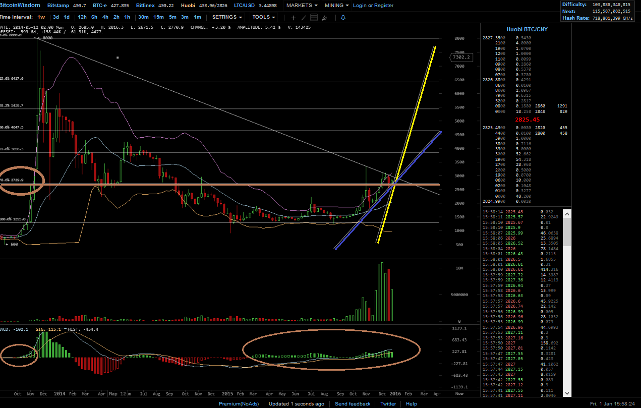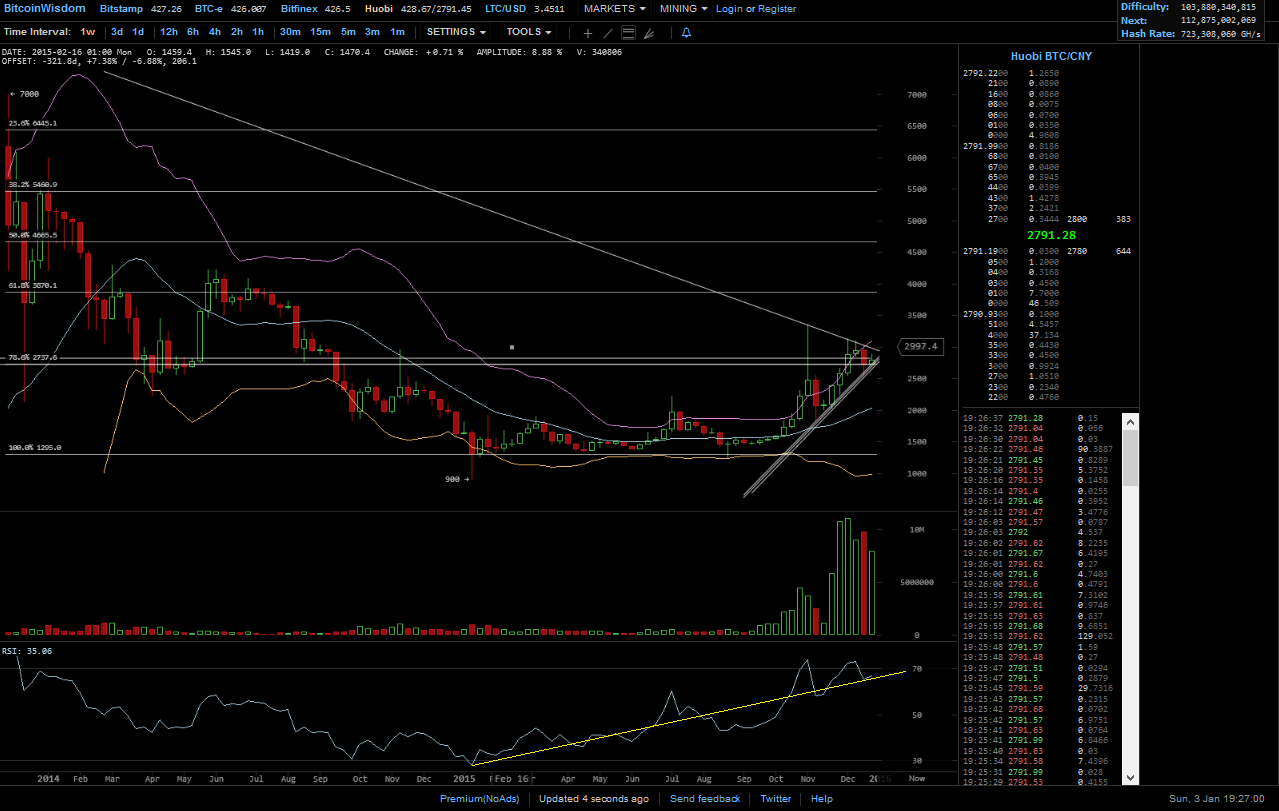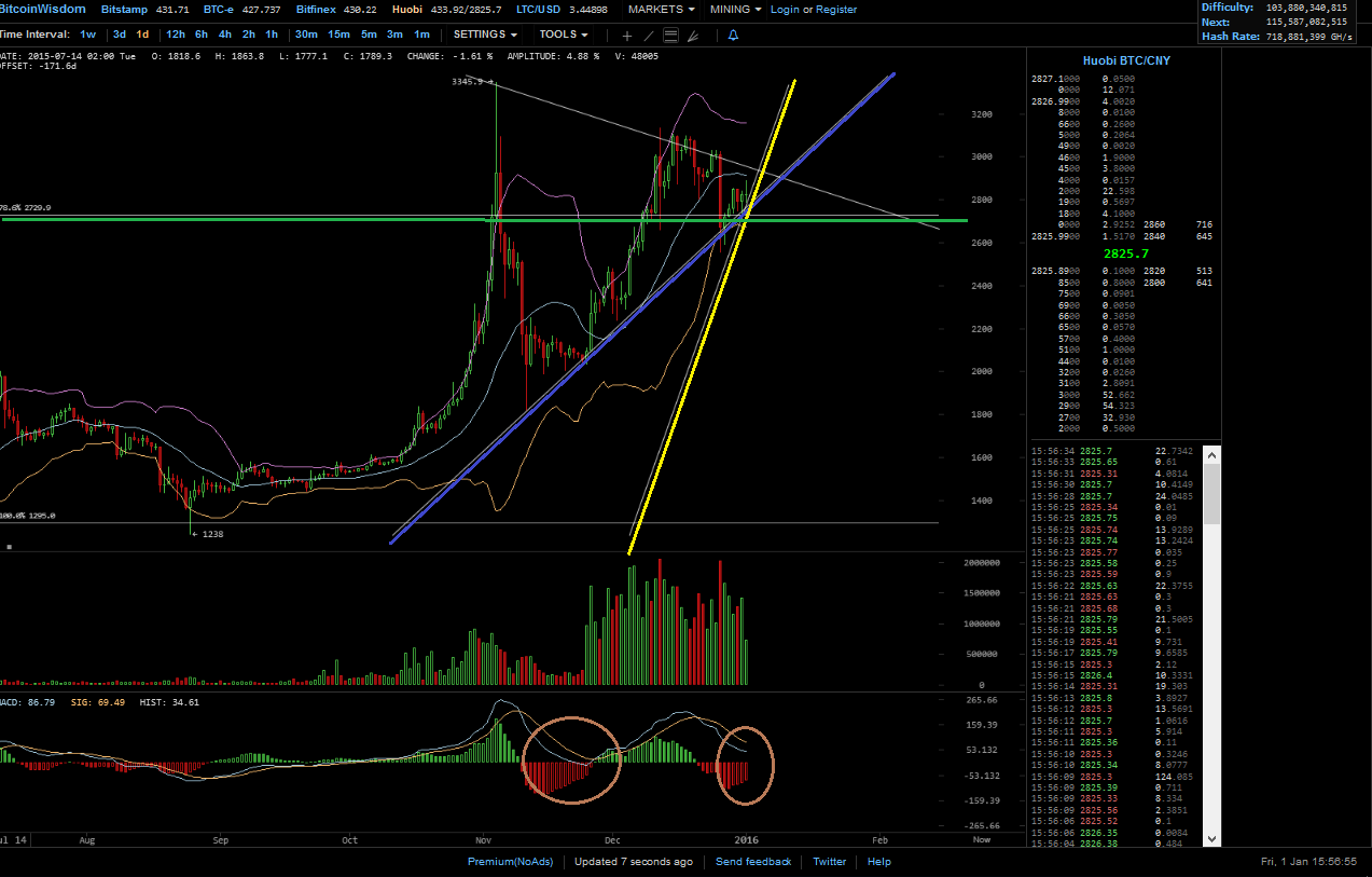 hier hat MACD (zeigt keinen Trend, sondern die Marktbewegung an) die down welle hinter sich, die zwei linie sind nahe der null linie! Unter der nulllinie zeigt einen bärischen markt an, darüber einen bullischen markt! Das die zweite welle candles wird schwächer.. die linie sind weiterhin bullish. der RSI in der Aufwärstbewegung knapp unter 50, auch er zeigt ein bullishe tendenz, ich prüf gar nicht soviel charts, meist nur stunden, tag und wochen. wenn ich nun noch, hier hinschau auf den tag, seh ich das nach oben gekauft wird (nochmal kein bulle bezahlt mehr als er muss), gerade lass sie den preis kommen, damit sich da bid füllt, dann sollte ein weiterer kauf folgen, diesen bitte abwarten. Edit da ist er schon ca. 21 wie auch 13 uhr dann ca. 19 uhr, hier war es sehr stark, einfach mal die börsen durch klicken in USD sogar BTC-e (die russische bank wollte doch keine BTC, war doch so oder?) war gut dabei, wartet auf die 440-450, sind die durch, dann gehts auch weiter
