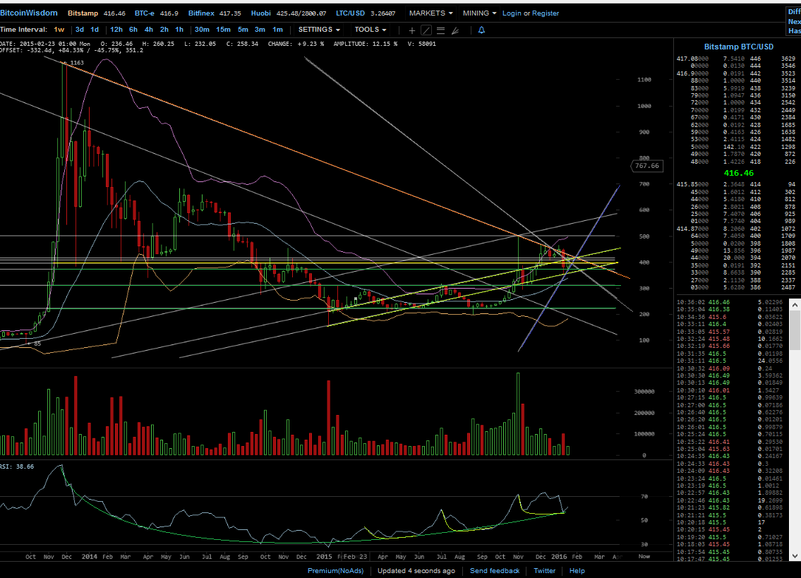 blau - short up trend, MACD zeigt dies auch, zwei wellen nach unten, die Linien bewegen sich auf einander zu, kreuzen sie wird es richtig bullish, markiert mit kreis blau. das kreuz für den wechsel in einen strong bullish markt, steht rechts und es wird eng, der heutige Tag sollte ruhig verlaufen.. und morgen oder heut abend könnte es spannend werden. da die bullen bewiesen haben das sie daran glauben, geh ich davon aus, das dann endlich über den long downtrend geht. aber das ist reine spekulation
