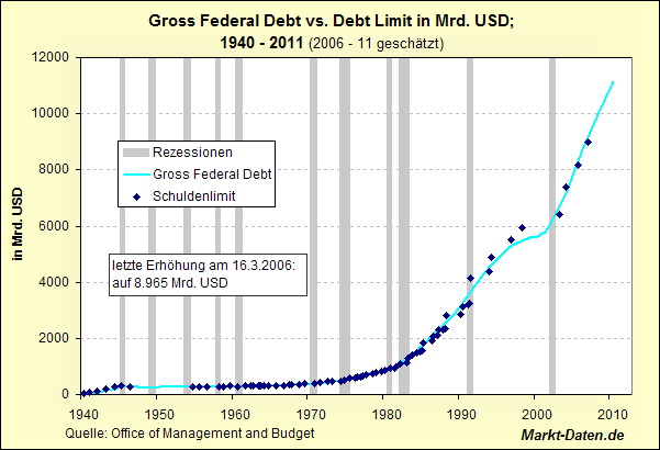 Kommen wir zu den Fakten: In den letzten 10 Jahren ist die Staatsverschuldung der USA relativ gesunken, und zwar ohne Unterbrechung in jedem Jahr. Die relevanten Größen, die letztendlich das Maß der Verschuldung widerspiegeln, sind das nominale Bruttoinlandsprodukt eines Landes und die Höhe seiner Schulden. In der Europäischen Währungsunion wird hier eine Unterschreiten der 60%-Marke gefordert, Staaten wie Belgien reißen diese Hürde, auch wenn sie sich schon sehr gebessert haben (Japan übrigens auch, obwohl sich auch dort die Lage sehr stark gebessert hat). Die USA schaffen das locker und haben, wie oben angeführt, ihre Verschuldung in jedem der letzten 10 Jahre in jedem Jahr zurückgeführt, weil durch das hohe Wachstum das nominale Wachstum des BIP immer, Jahr für Jahr, höher war als die Zunahme der Verschuldung. Inzwischen ist die Welt noch besser geworden: Die Neuverschuldung der USA wird jedes Jahr (seit ca. 3 Jahren) um ca. 100 Milliarden absolut kleiner. Dies erklärt auch u.a. die im Vergleich zu vorhergehenden Perioden niedrigen Kapitalmarktzinsen: Die ganze Welt (einschließlich der Chinesen) schlägt sich um die wenigen US-Schuldtitel - ein wichtiger Grund für die niedrigen Kapitalmarktzinsen der letzten Jahre.