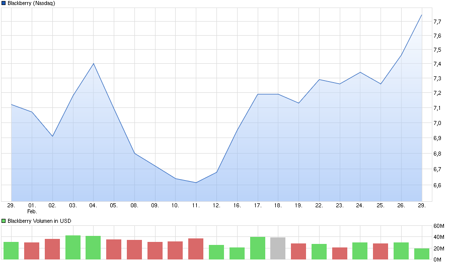 Von 8$ fair bewertet. Um weiter steigende Umsätze bzw. steigende Aktienkurse zu erreichen, müsste Bbry als Zulieferer von Software schon einen Grossauftrag im Verbrauchermarkt an Land ziehen. Die Hoffnung bleibt noch im Security, Autogeschäft sowie IOT das Bbry sich hier eine bedeutende Rolle aufbauen kann. Die Konkurrenz ist jedoch gross, jeder Player