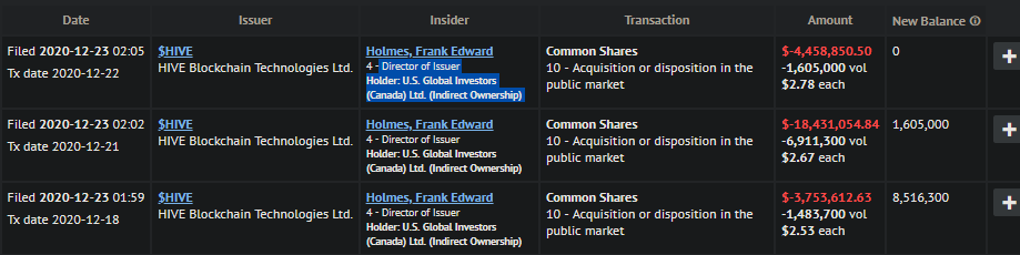 Holmes hat alle seine Aktien, die er von HIVE hatte, am Markt verkauft. 20 Mio$
