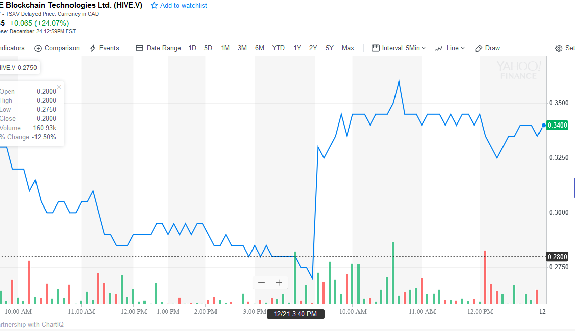 Da sich während dem Handelsverlauf die Kryptopreise auf ihrem Weg nach oben beruhigten und sogar nachgaben, kletterte der HIVE-Kurs immerhin noch um 24% nach oben.