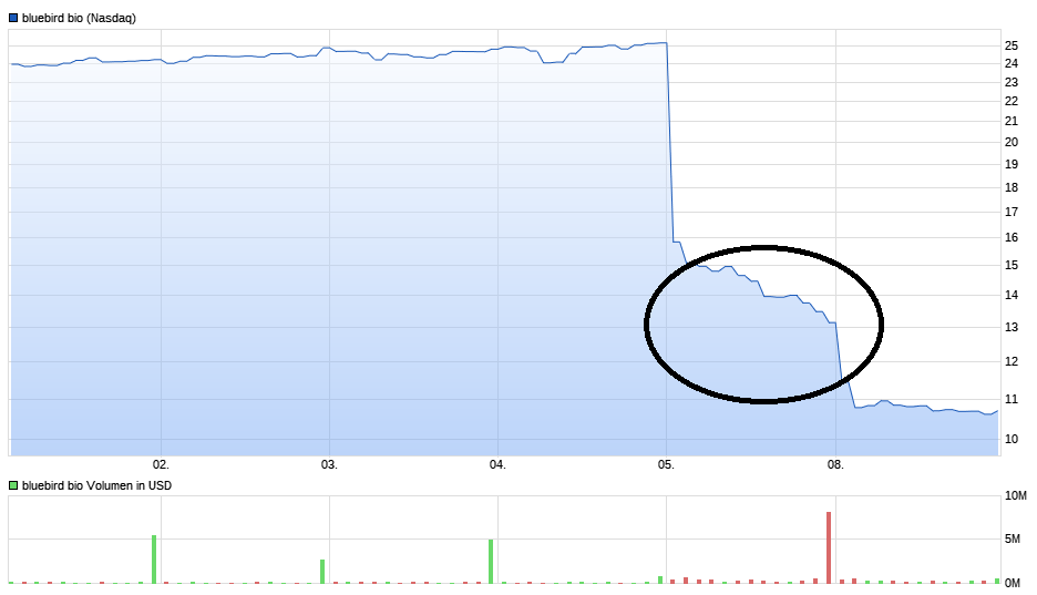 Ich hatte sowas ähnliches schon vermutet, aber aufgrund der Unklarheiten bzgl. des Spin-Offs habe ich es gelassen. Meine Berechnung aus Posting #260 für den 2seventy bio Kurs (31,40$) kommt in etwa hin. Damit sich das Verhältnis angleicht müsste die BLUE Aktie sich halbieren auf ~10$. BLUE (alt) war vorher ca. 1,3 Mrd. $ wert, BLUE (neu) ist 1 Mrd. $. wert und TSVT müsste mit ~750 Mio. $ bewertet sein. Vorher 1,3 < nachher 1,75. Theoretisch müsste BLUE noch weiter abgeben. Wer den Spin-Off mitgemacht hat, sollte sich jetzt überlegen, BLUE schnell zu verkaufen.