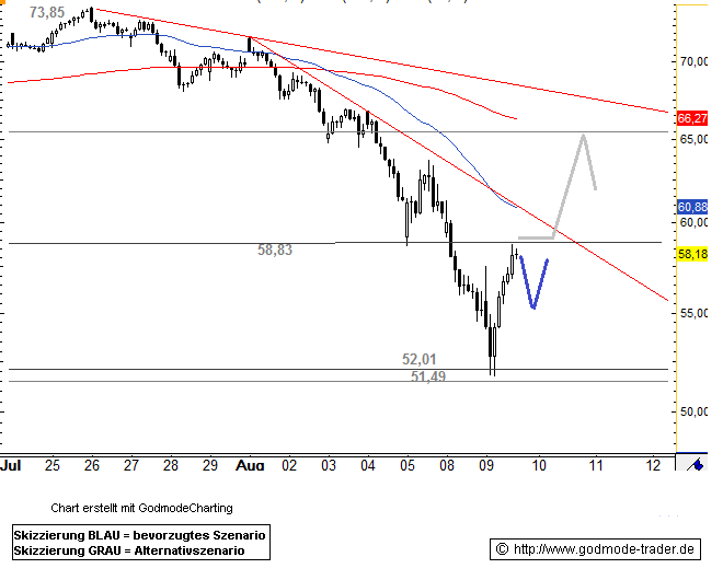 Dass die Aktie bereits heute in diesen Bereich fallen würde, hatten wir nicht gedacht. Wer dennoch den Mut nicht verloren hat und in diesem Bereich zugegriffen hat, der darf sich inzwischen über mehr als ansehnliche Kursgewinne freuen. Denn die Aktie schoß nach einem Tagestief bei 51,71 Euro radikal nach oben und notiert aktuell bei 58,18 Euro und damit auf Tagesbasis mit 5,51% im Plus. 12,51% hat die Aktie seit dem Tagestief zugelegt. Das ist eine mehr als außergewöhnliche Bewegung. Damit notiert der Wert bereits am Widerstand bei 58,83 Euro. Hier könnte die Erholung nun eingebremst werden, ja sogar ein Rückfall in Richtung 52,01 – 51,49 Euro kann nicht ausgeschlossen werden.