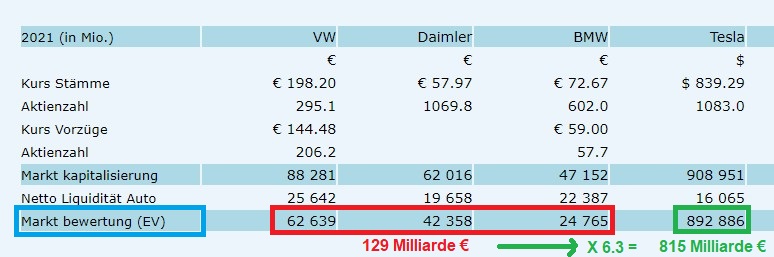 Tesla ist aktuell nicht "nur" mehr wert als die drei Deutschen Autobauer zusammen, sondern 6,3x mehr Wert.