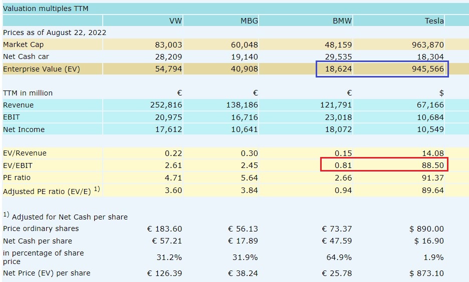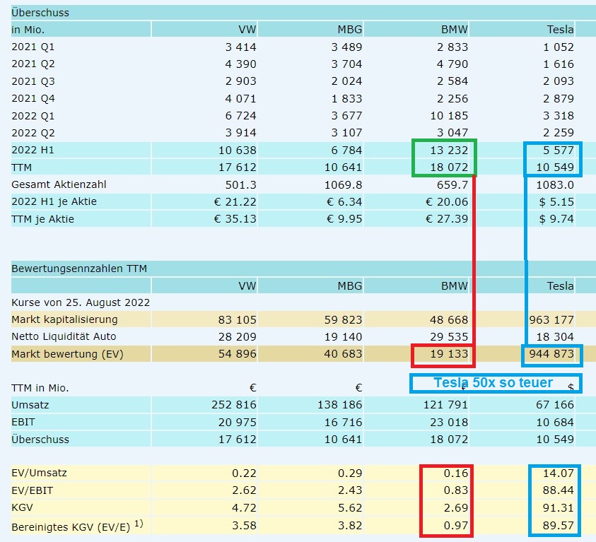 Was hat der für ein Bewertunsgmodell dass er jeden Euro der Tesla verdient für 100x wertvoller ansieht. BMW einstuft extrem unter der Liquiditationswert.
