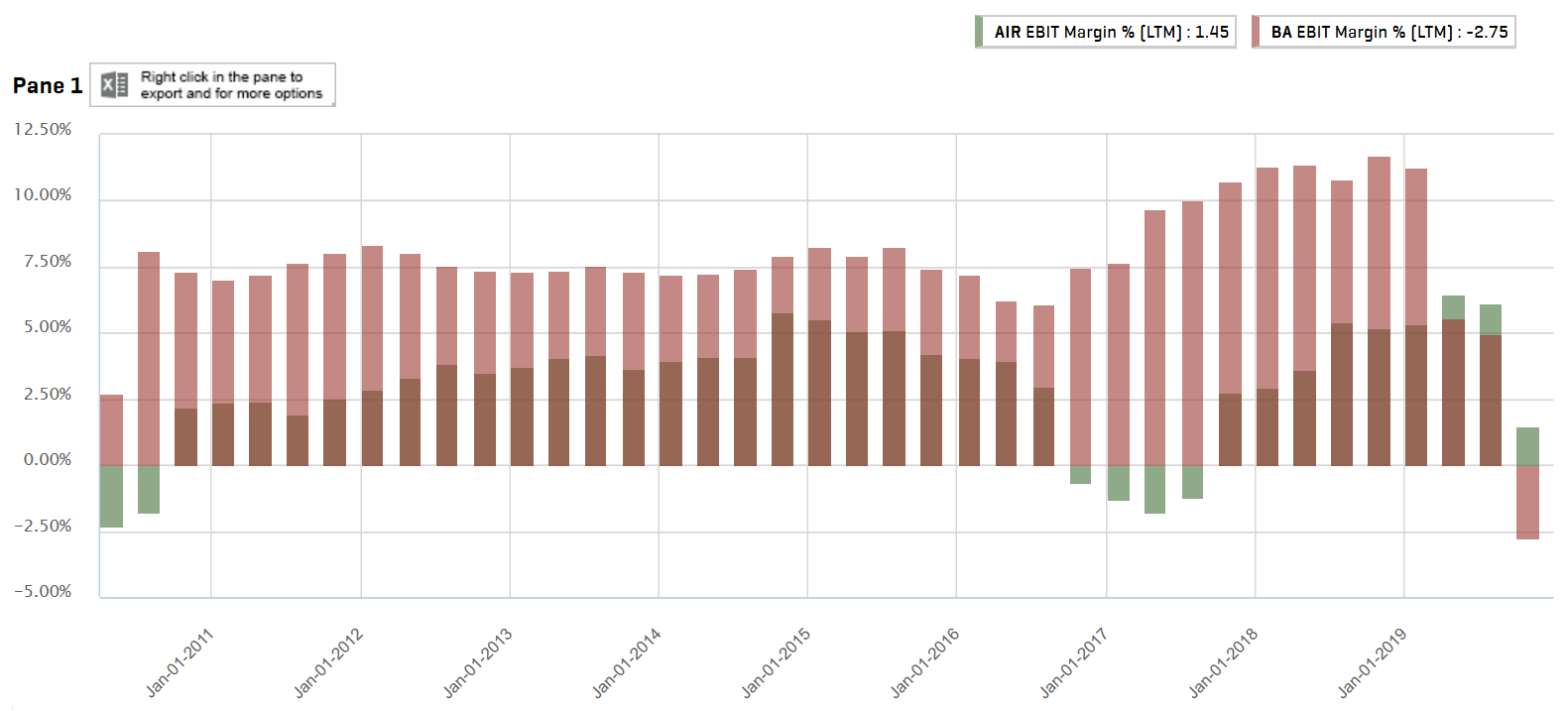 Bzgl Vergleich mit Airbus siehe EBIT Performance der letzten 10 Jahre. Airbus hat no chance - wenn man die Sondersituation bei Boeing von 2019 ausblendet. Das Bild für Return on Assets (also wie Effizienz die Bilanz eingesetzt wird) und Return on Equity sieht noch krasser aus. Boeing um Welten besser. Den einzigen Vorteil den ich auf Anhieb bei Airbus in der Bilanz sehe, ist, dass sie 2019 net cash waren.