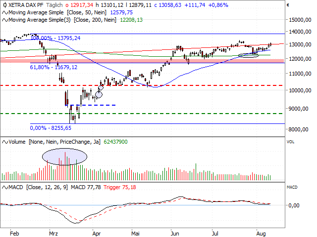 Nach einem vergeblichen Versuch am Vortag schaffte der DAX® gestern per Tagesschlusskurs die Rückeroberung der 13.000er-Marke. Für charttechnisch bedeutender halten wir allerdings die Rückkehr in den alten Erholungstrend seit Dezember 2018 (akt. bei 13.014 Punkten). Letzteres sorgt nochmals für ein zusätzliches Ausrufezeichen hinter dem eingeschlagenen Aufwärtsimpuls. Damit rückt das Verlaufshoch vom 21. Juni bei 13.314 Punkten mehr und mehr in den Mittelpunkt. Diese Marke definiert gleichzeitig den Auftakt zur großen Kurslücke von Februar, welche sich bis 13.501 Punkte erstreckt. Danach stünde als nächster (und letzter) Widerstand bereits das bisherige Allzeithoch bei 13.795 Punkten zur Disposition. Das Zeitfenster, um die angeführten Barrieren ins Visier zu nehmen, bleibt unter saisonalen Gesichtspunkten noch bis Anfang September günstig (siehe Analyse unten). Auch das Sentiment steht einer Fortsetzung der Rally (noch) nicht entgegen. Zwar hat sich Stimmung gemäß der jüngsten AAII-Erhebung verbessert, doch die Bullen (30 %) sind im Vergleich zu den Pessimisten (42 %) weiter in der Unterzahl. Als kurzfristige DAX®-Absicherung ist unverändert das jüngste Aufwärtsgap bei 12.753/12.803 Punkten prädestiniert.